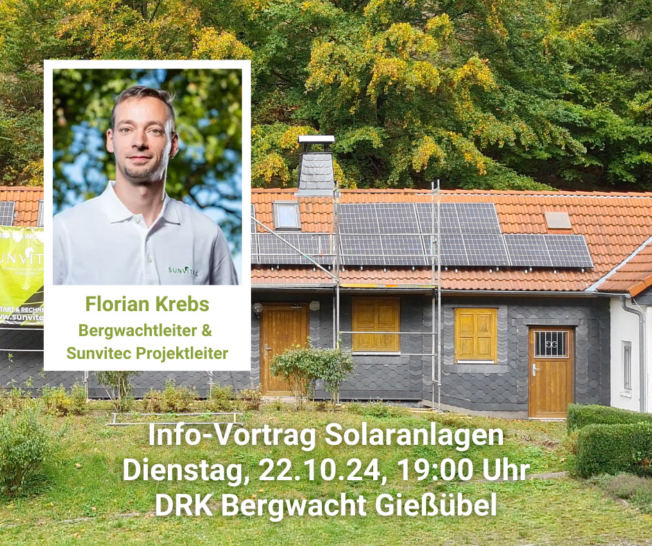 Neben der Eröffnung gab es zusätzlich im Oktober 2024 ein Info-Abend im DRK Bergwacht-Stützpunkt Gießübel. Interessierte konnten sich vor Ort einen Eindruck verschaffen und die Solaranlage in Aktion sehen. Falls Sie mehr über die Details oder eine Besichtigung vor Ort wünschen, melden Sie sich gern beim Projekleiter Florian Krebs per E-Mail unter florian.krebs@sunvitec.de.